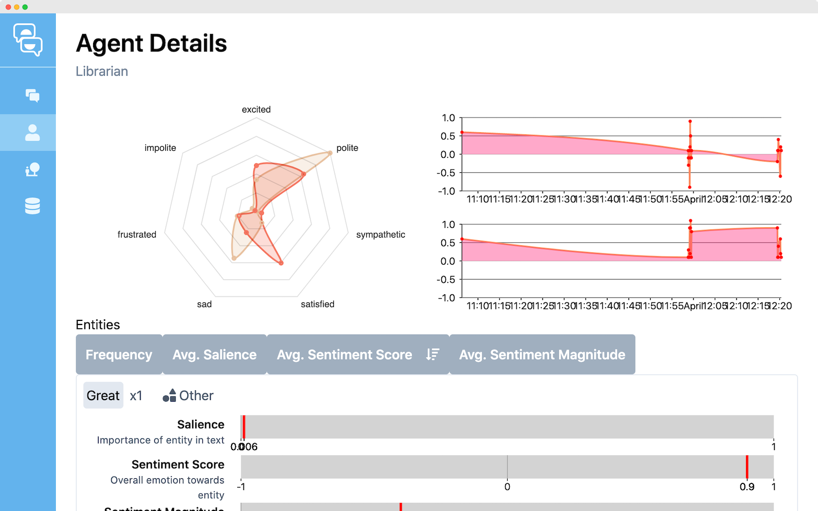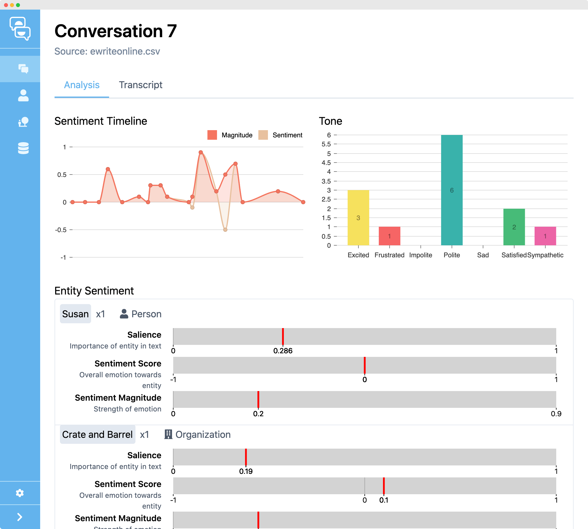 Extract sentiment, emotionality, tone and entities present in conversations. See customer satisfaction from the right angle, start to finish. Identify hostile interactions, reward exemplary conduct on a per-conversation basis.