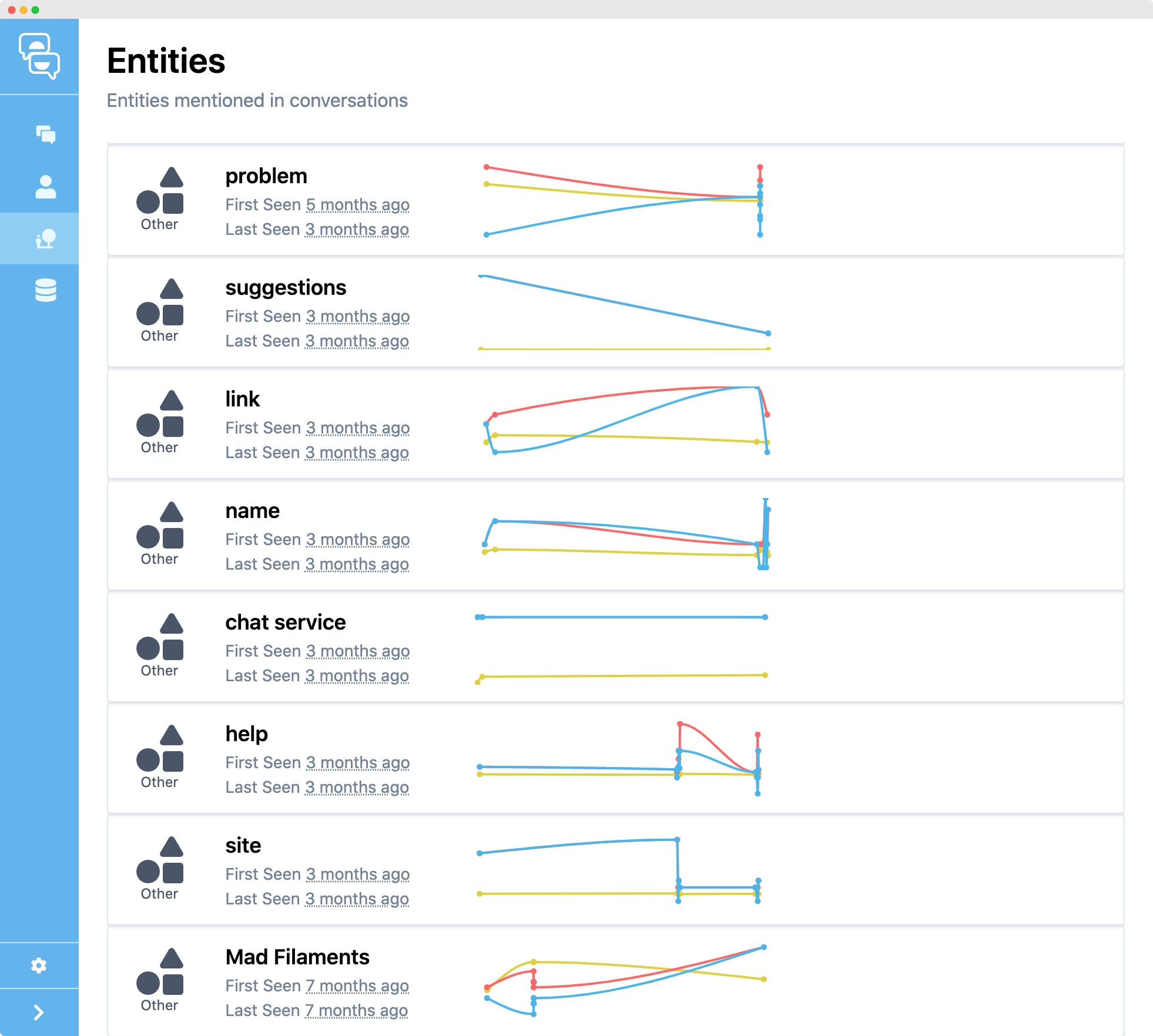 Go beyond simple interactions and see the big picture. Identify patterns in customer communciations by seeing interesting entities like objects, places, concepts or topics evolving over time.